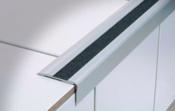 Profilo per gradino in alluminio anodizzato argento con striscia antisdruccioloProfilo per gradino in alluminio anodizzato argento con striscia antisdrucciolo. Barra da 2,70 m. Posa con silicone o viti.